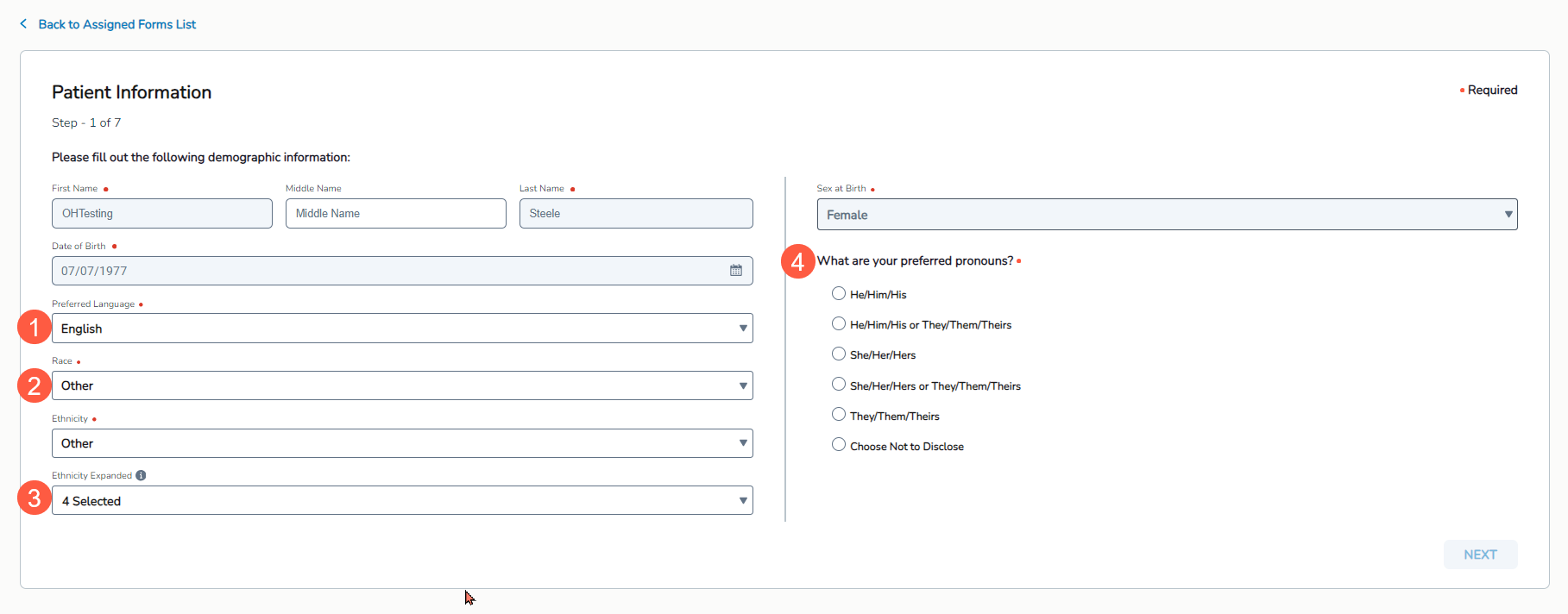 Ethnicity Expanded: After choosing an ethnicity, patients can use this new field to choose up to 4 additional ethnicity options to better detail their ethnicity (callout 3).