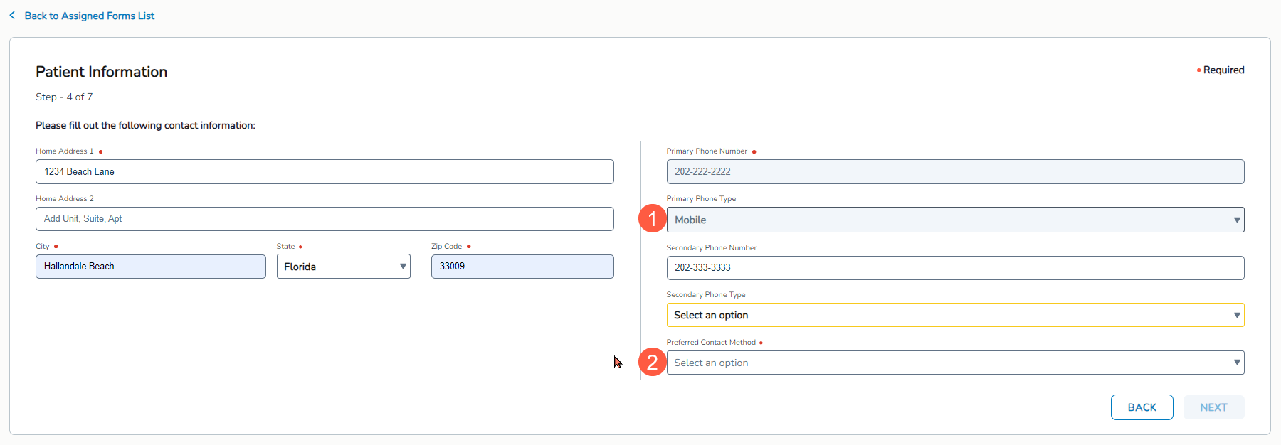 Preferred Contact Method: A new required field will display for patients to choose one of the following preferred contact methods from a drop-down: Mobile Phone, Email, Home Phone, or Work Phone (callout 2).