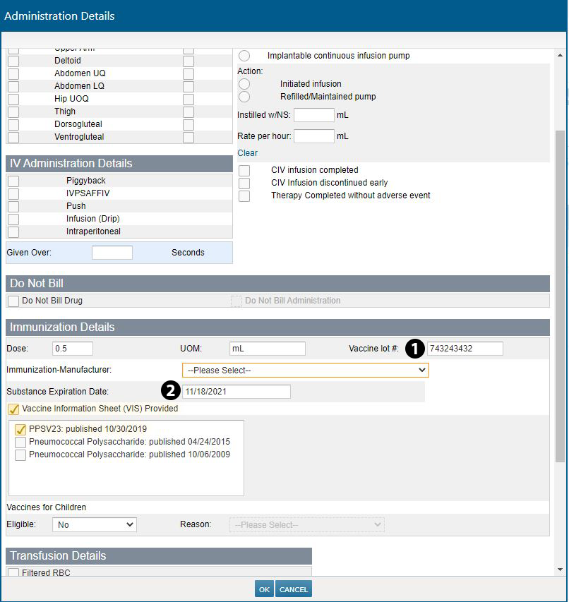 To decrease potential transcription errors and duplication of work, the lot # and expiration date for a vaccine entered manually or populated from Lynx on the patient’s Admix page will now carry over to the Nursing Care > MAR. Select Admin Details from the immunization listed and scroll to Immunizations Details section to view the prepopulated information (see callouts 1 and 2).