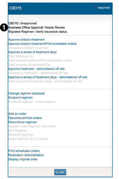 This field will alert users that they must verify the patient’s insurance approval status and will remain in the cycle day window until the patient’s regimen is processed through Worklist Queues > Ins. Auth/Fin. Counseling. Please note this applies to all past and future migrated regimens.