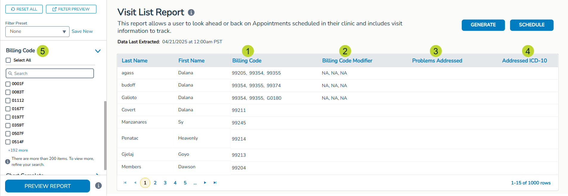 The Visit List Report will include the following billing-related columns for each date of service (callouts 1-4):