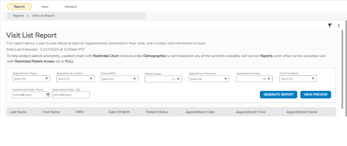 For users with Reports permissions set to Full for Administration, Front Office, or Office Manager, the Visit List Report offers a powerful tool to anticipate or review appointments at their practice. This report provides insights into appointment details, such as appointment date, location, and assigned resources.